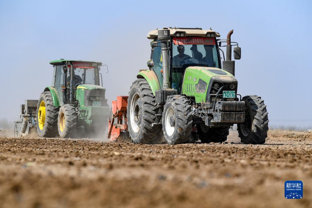 3月3日,在寧夏銀川市賀蘭縣立崗鎮蘭星村,農民駕駛農機播種春小麥。