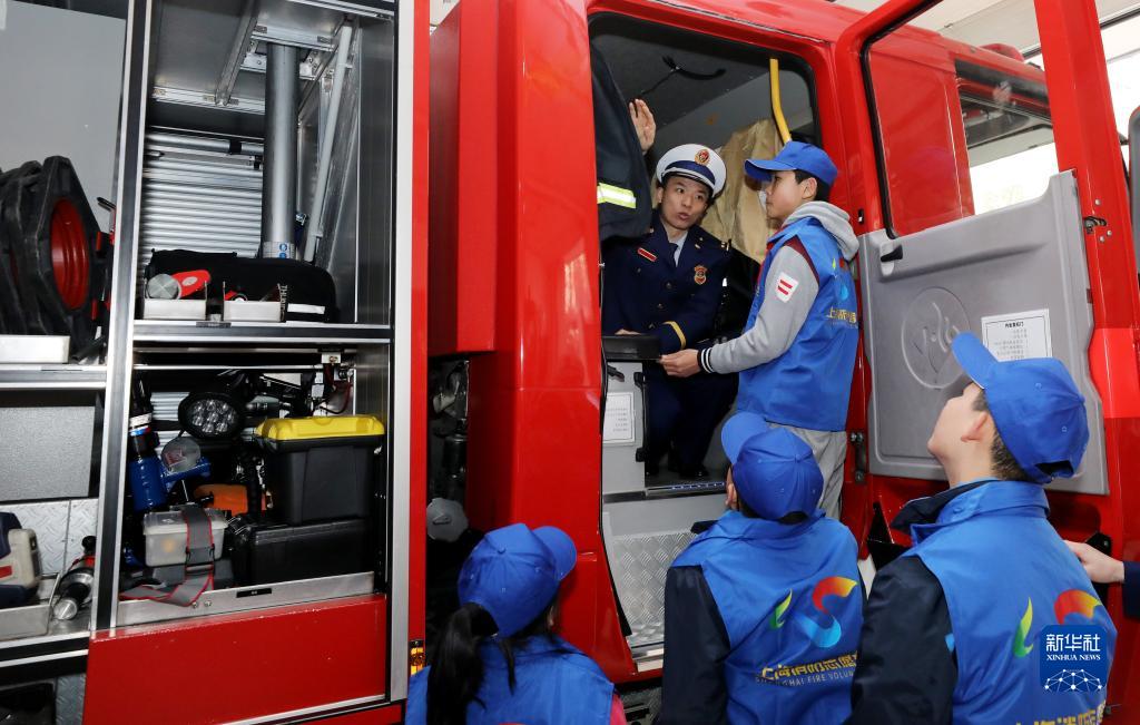 3月3日,“小小消防志愿者”服務隊隊員在消防員講解下了解消防車內的設備。