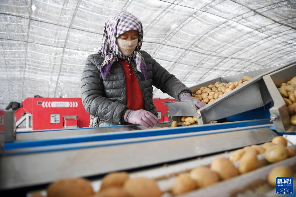 工作人員在寧夏西吉縣恒豐馬鈴薯種薯脫毒繁育中心分揀馬鈴薯原原種(3月2日攝)。