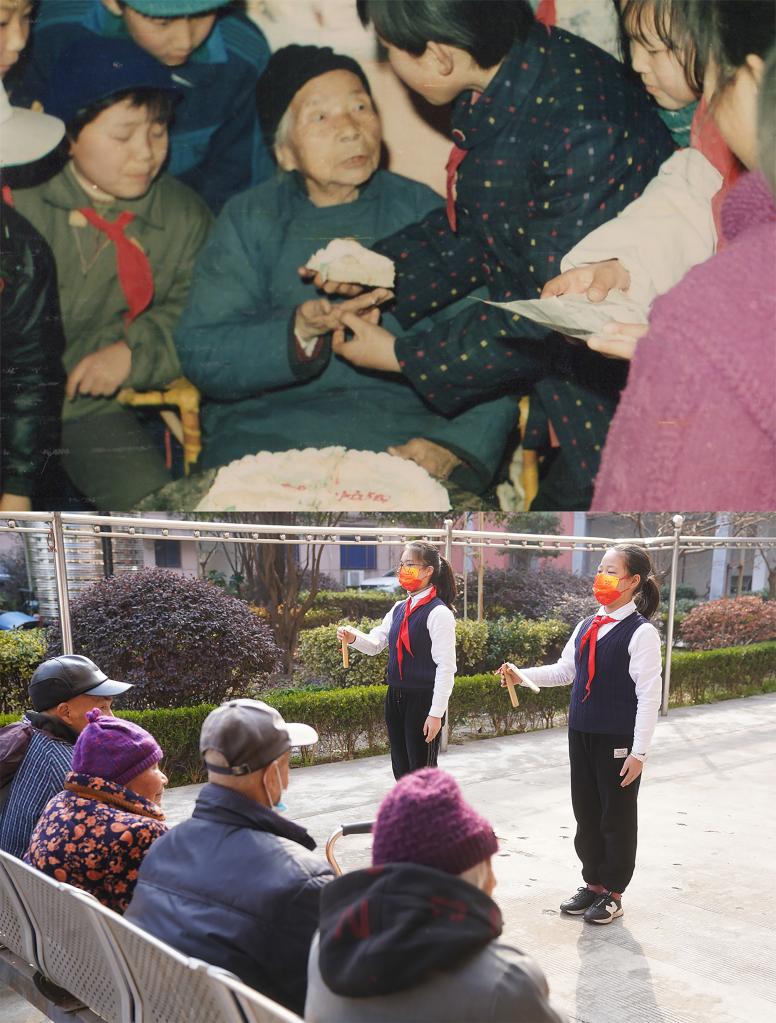上圖:上世紀80年代,金沙小學五(2)雷鋒中隊隊員為孤寡老人慶祝生日(新華社發);下圖:2月24日,金沙小學學生們為當地敬老院老人表演節目(新華社記者 季春鵬 攝)(拼版照片)。