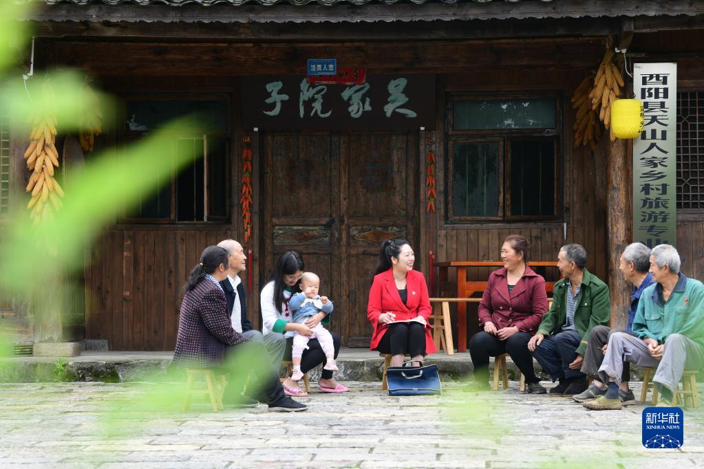 全國人大代表、重慶酉陽土家族苗族自治縣桃花源街道天山堡村黨支部書記、村委會主任冉慧(右五)在調研鄉村旅游發展情況(2020年5月15日攝)。