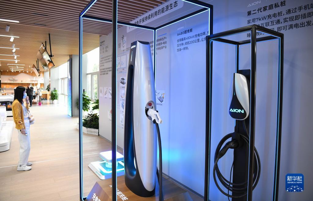 在廣汽埃安新能源汽車股份有限公司現場展示的超充樁和家庭充電樁(2月24日攝)。
