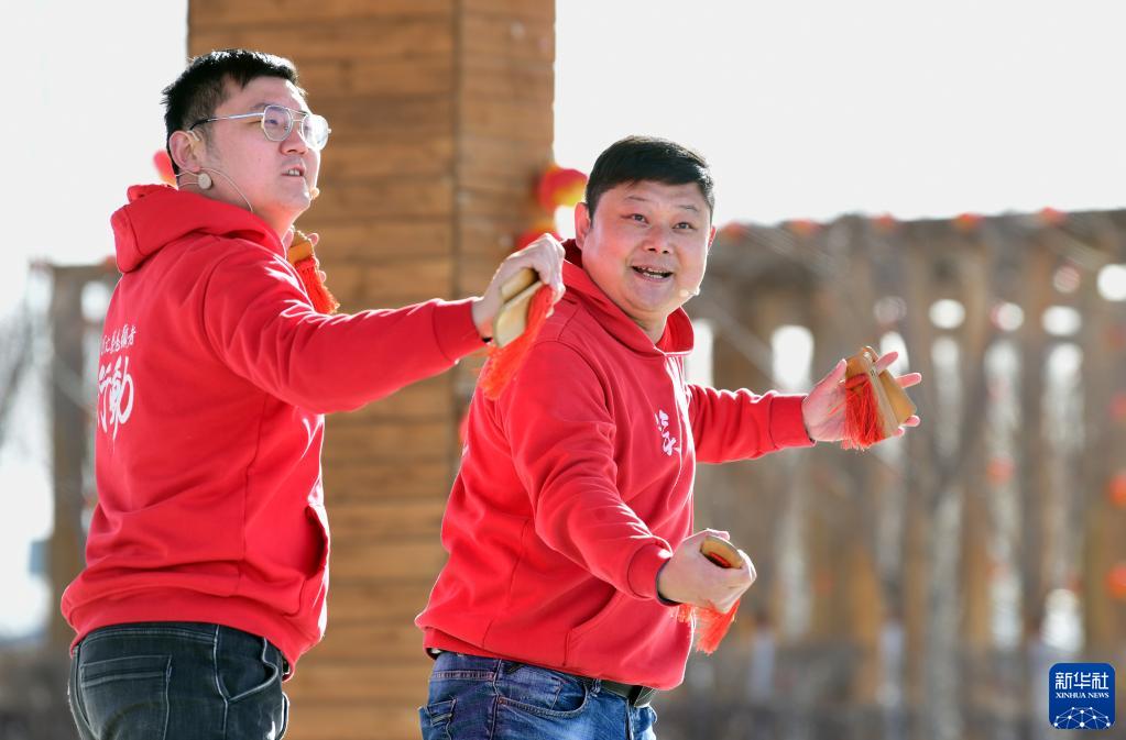 3月3日,在二連浩特市格日勒敖都蘇木賽烏素嘎查文化廣場,文藝志愿者為群眾表演對口快板。