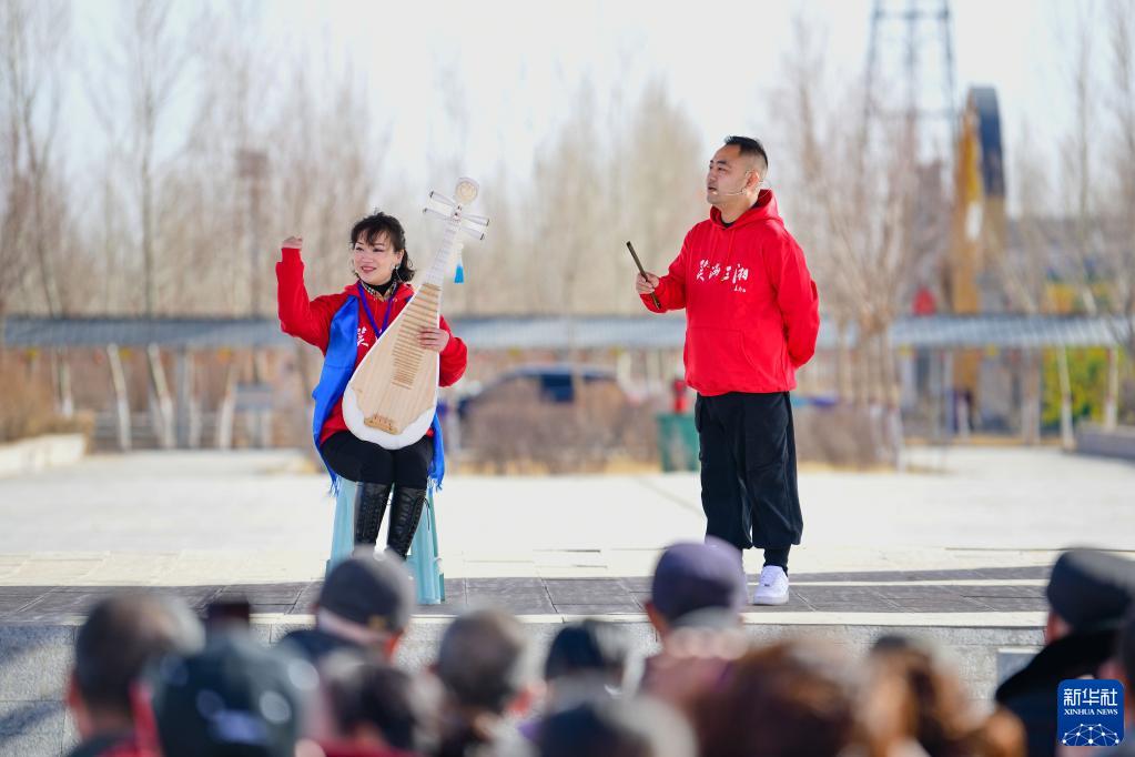 3月3日,在二連浩特市格日勒敖都蘇木賽烏素嘎查文化廣場,文藝志愿者為群眾表演節目。