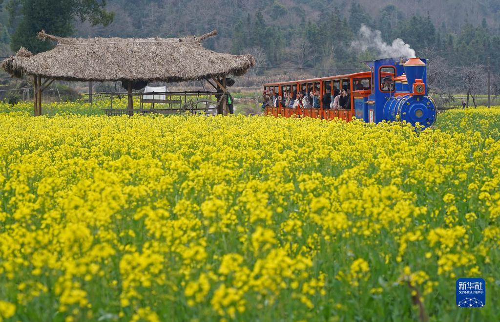 游客在江西省婺源縣嚴田景區乘坐“小火車”觀賞花海(3月3日攝)。