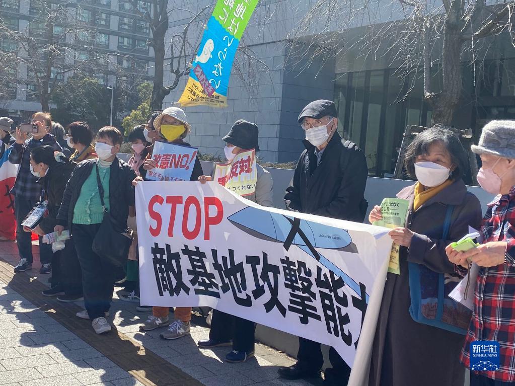 2月28日,在日本東京,日本民眾舉著標語牌抗議日本眾議院通過高額的防衛費預算案。
