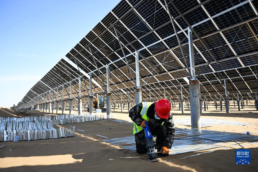 3月3日,工人在內蒙古鄂爾多斯市達拉特旗光伏發電基地作業。