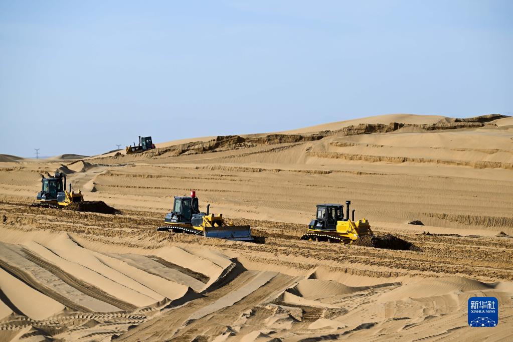 3月3日在內蒙古鄂爾多斯市達拉特旗拍攝的建設中的庫布其沙漠鄂爾多斯中北部新能源基地項目。