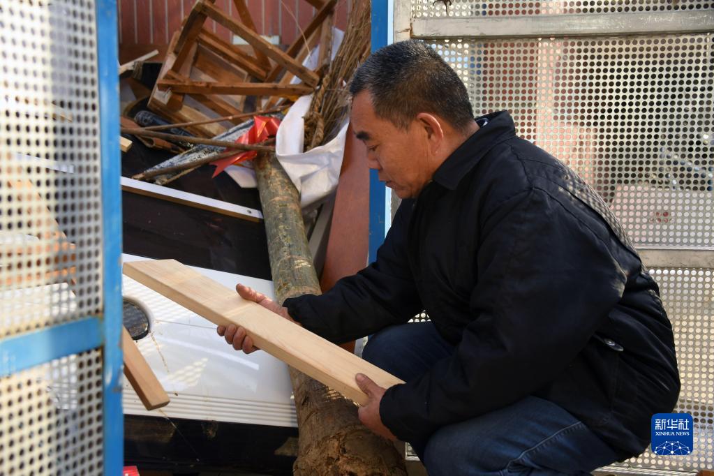 3月4日,在北京市順義區旺泉街道宏城花園社區大件垃圾回收站,殷萬江挑選適合制作扶手的材料。