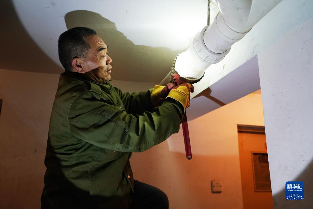 在北京市順義區旺泉街道宏城花園社區一座居民樓的地下室,殷萬江維護污水管道(2月23日攝)。