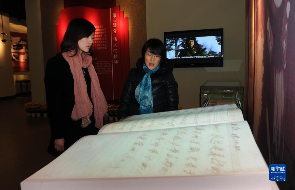 張璐琪(左)在湖南雷鋒紀念館里向母親譚荒芳請教講解技巧(2012年2月21日攝)。