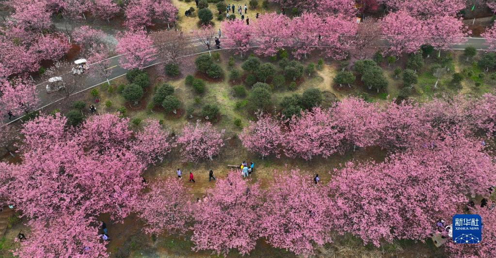 隨著氣溫回暖,湖南省常寧市羅橋鎮櫻花園里的3000多畝櫻花次第綻放,春色滿園,吸引游客前來觀賞游玩。