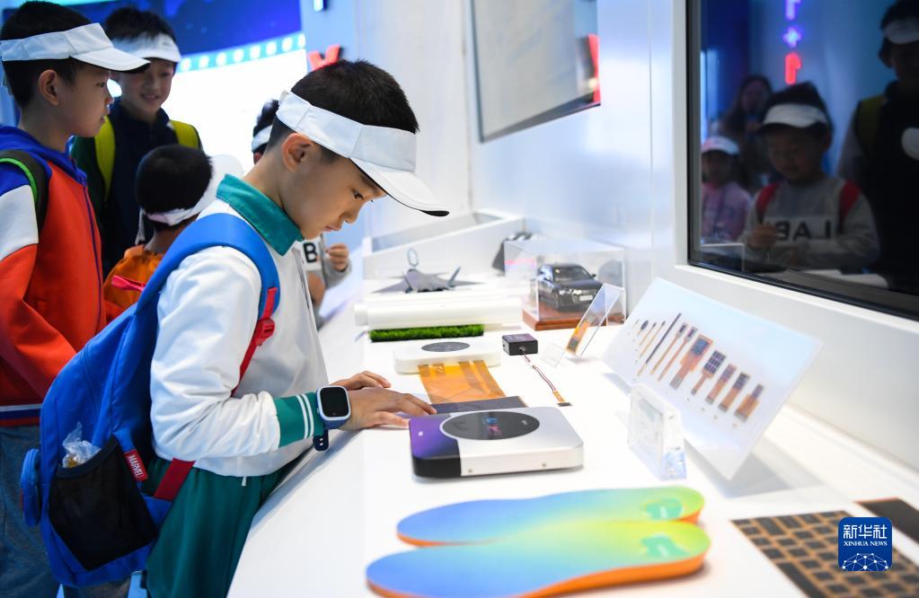 3月4日,在廣州黃埔區的航空輪胎大科學中心展覽館,參加研學活動的小朋友觀看新材料產品。