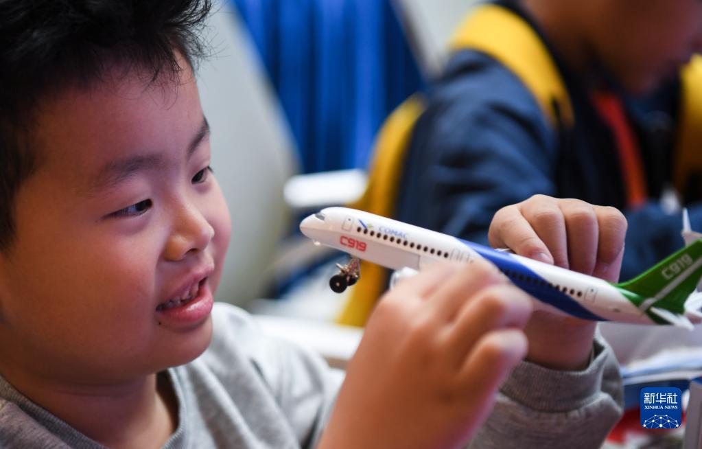 3月4日,在廣州黃埔區的航空輪胎大科學中心展覽館,參加研學活動的小朋友觀看國產飛機模型。