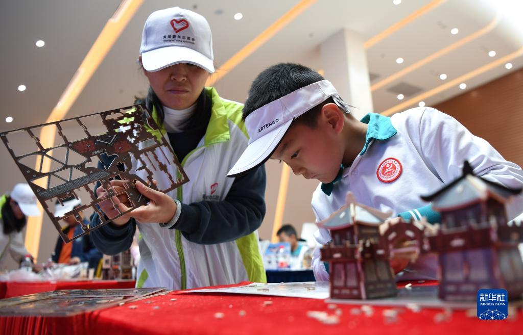 3月4日,在廣州黃埔區的航空輪胎大科學中心展覽館,參加研學活動的小朋友在志愿者的幫助下制作建筑模型。