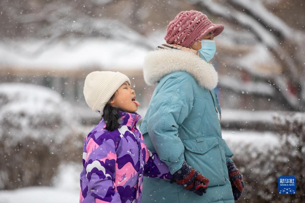 3月1日,在哈爾濱市古梨園,一名小朋友伸出舌頭品嘗雪花。當日,“冰城”哈爾濱市迎來一場春雪。