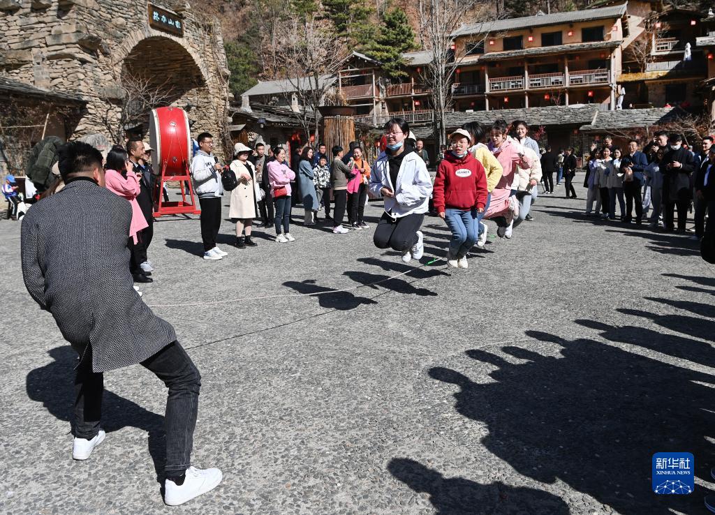 游客在柞水縣終南山寨景區娛樂(3月4日攝)。