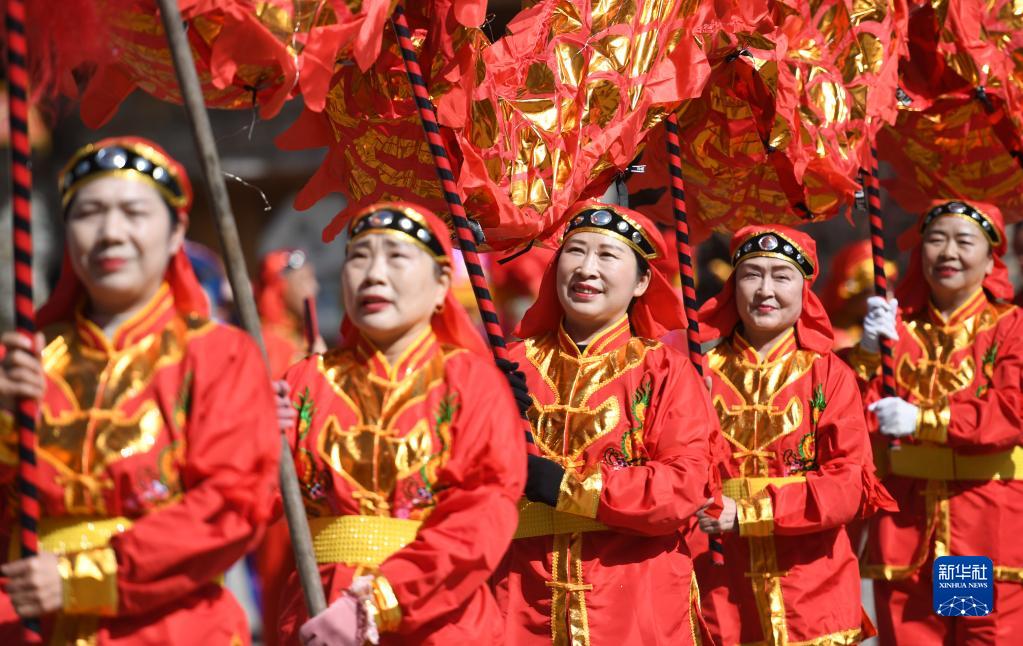 柞水縣終南山寨景區的工作人員進行舞龍表演(3月4日攝)。