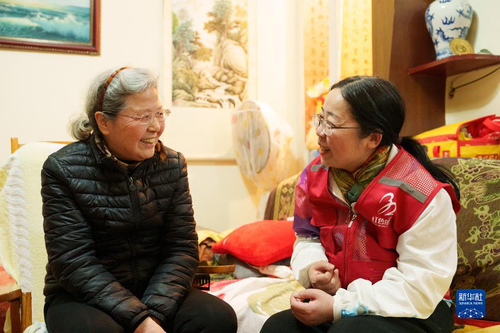 “小桔燈”服務社的志愿者在南昌市青云譜區三家店街道城南教師住宅小區陪空巢老人聊天(3月4日攝)。