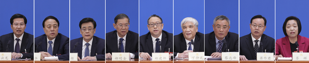 3月5日,全國政協十四屆一次會議在北京人民大會堂舉行民主黨派中央和全國工商聯領導人記者會。這是民革中央主席鄭建邦(左五)、民盟中央主席丁仲禮(右四)、民建中央主席郝明金(左四)、民進中央主席蔡達峰(右三)、農工黨中央主席何維(左三)、致公黨中央主席蔣作君(右二)、九三學社中央主席武維華(左二)、臺盟中央主席蘇輝(右一)、全國工商聯主席高云龍(左一)在記者會上(拼版照片)。