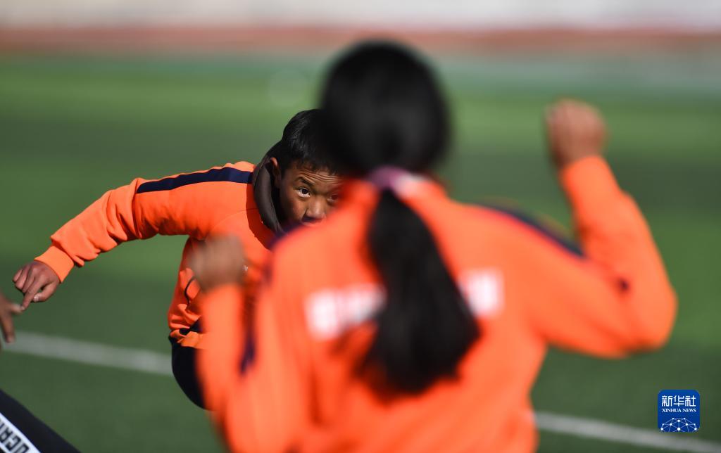 3月1日,在玉樹州曲麻萊縣第一完全小學,曲麻萊青訓隊球員白瑪加(后)在訓練課中。