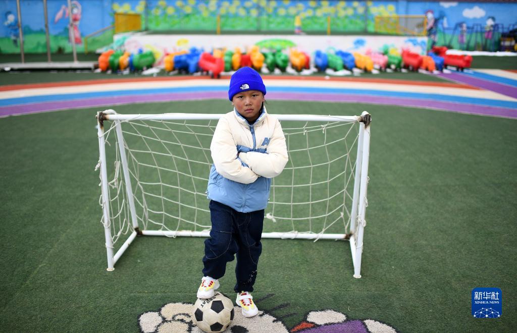 3月1日,在玉樹州治多縣,城南幼兒園小朋友羅松伊西在幼兒園的球場上。