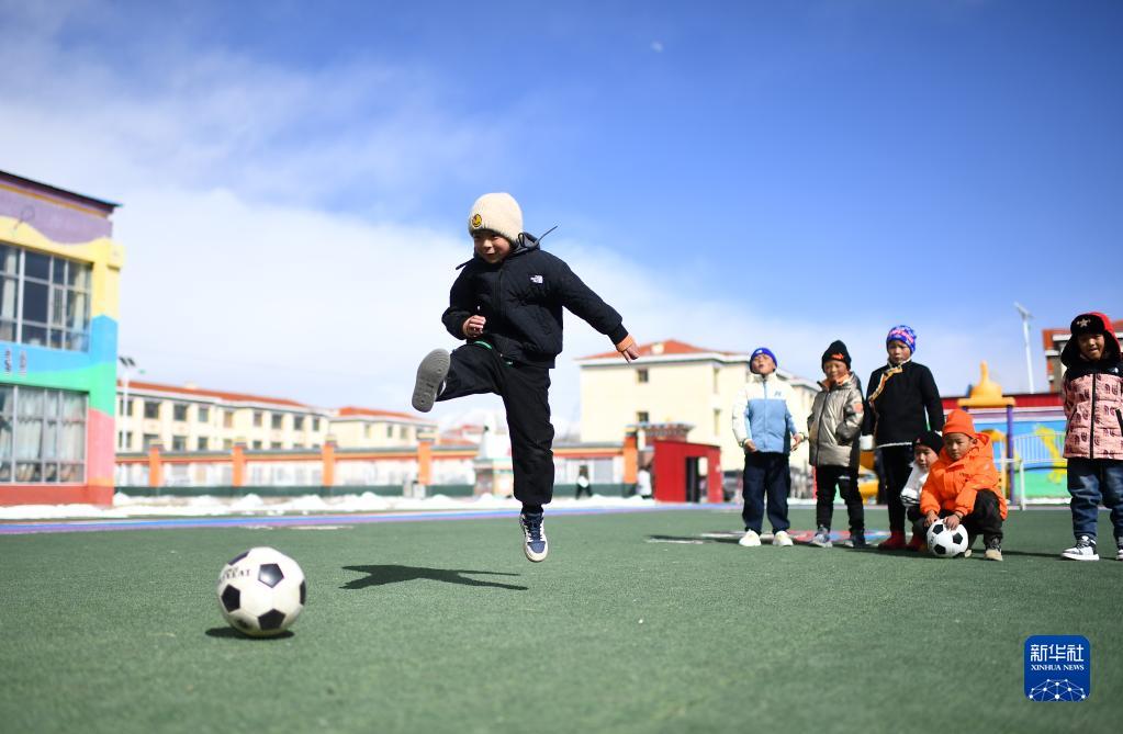 3月1日,在玉樹州治多縣,城南幼兒園小朋友旦增然桑(左一)在練習射門。