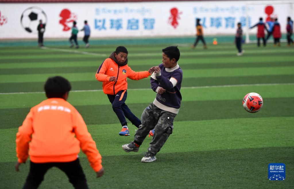 3月1日,在玉樹州曲麻萊縣第一完全小學,曲麻萊青訓隊球員白瑪加(左二)在訓練課上。