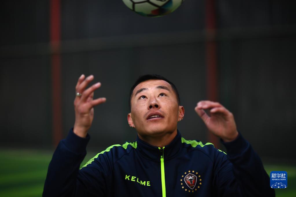 3月2日,在玉樹州玉樹市一處室內球場,玉樹康巴野牦牛足球隊隊員、2018-2019年“玉樹足球先生”尼瑪才仁在場邊熱身。