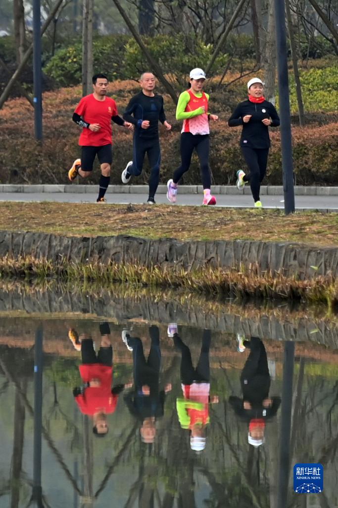 3月1日,跑步愛好者在浙江省寧波市奉化區仁湖公園晨跑。