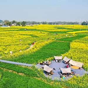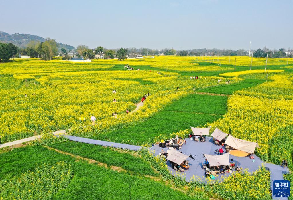 近日,位于四川成都崇州市的數萬畝油菜花競相綻放,吸引游客前來踏春觀光。