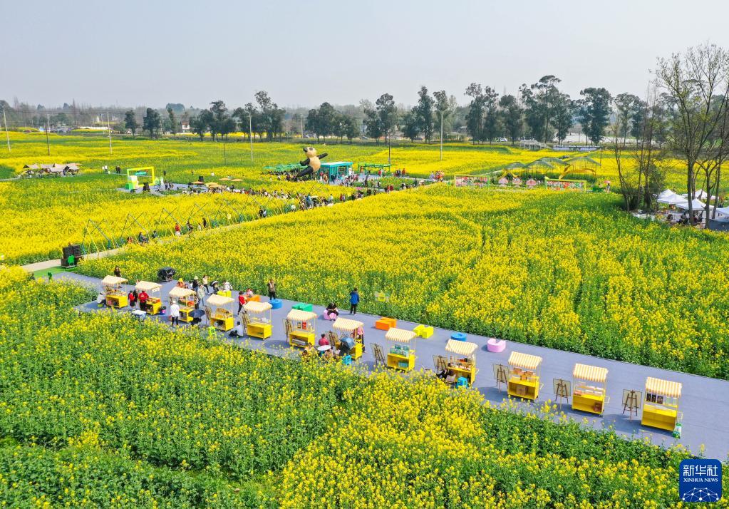 近日,位于四川成都崇州市的數萬畝油菜花競相綻放,吸引游客前來踏春觀光。