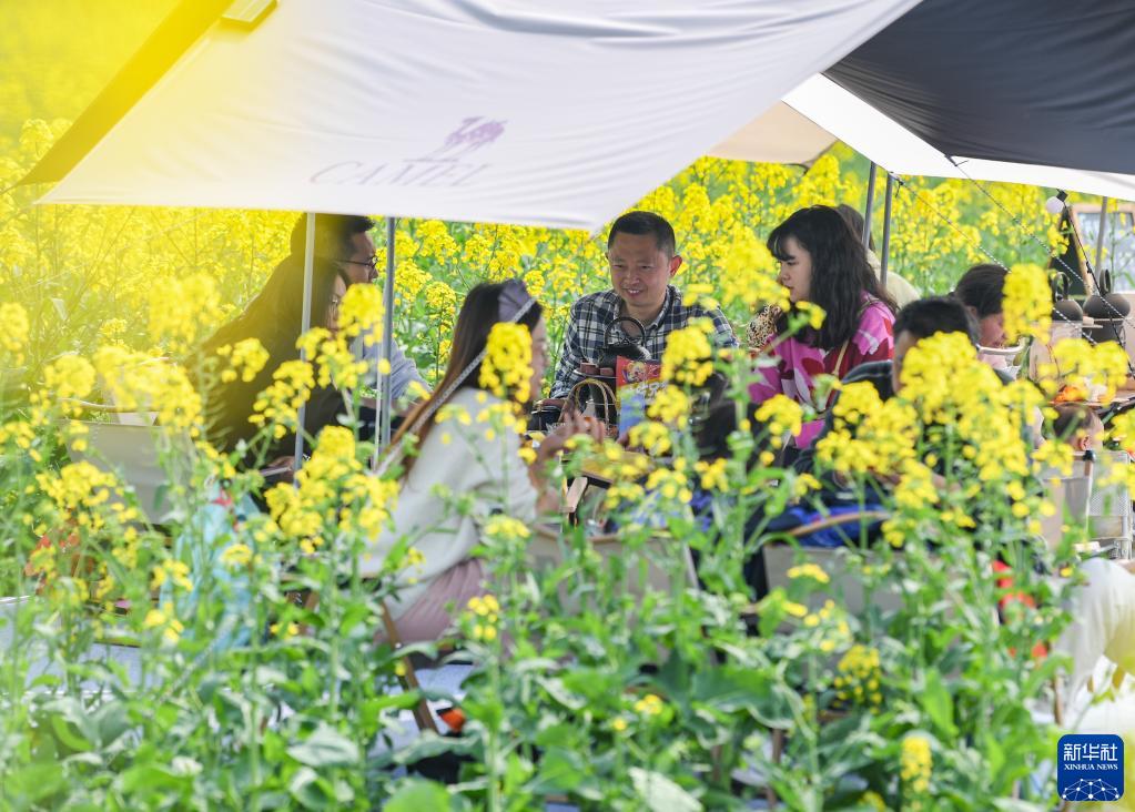 近日,位于四川成都崇州市的數萬畝油菜花競相綻放,吸引游客前來踏春觀光。