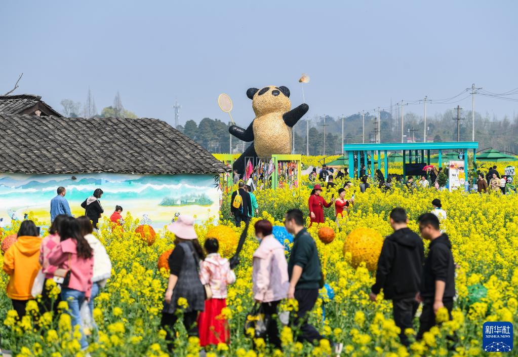 近日,位于四川成都崇州市的數萬畝油菜花競相綻放,吸引游客前來踏春觀光。