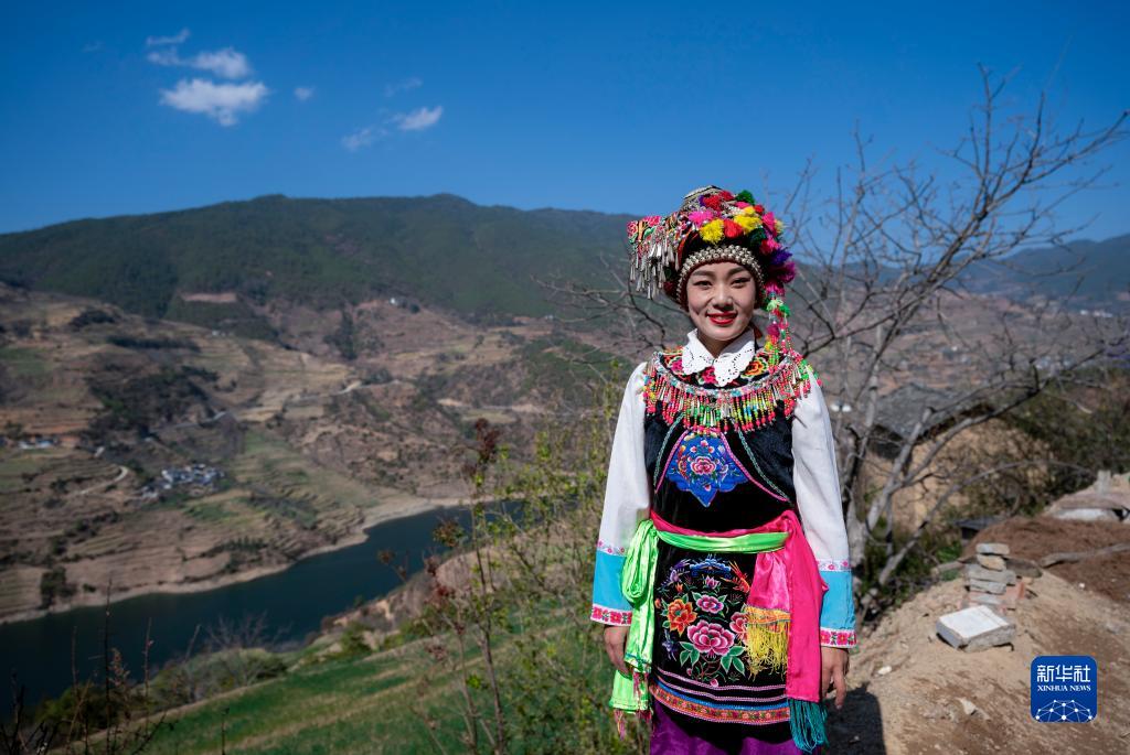 魯麗華身著民族服飾站在南澗縣樂秋鄉的山野里(2月6日攝)。