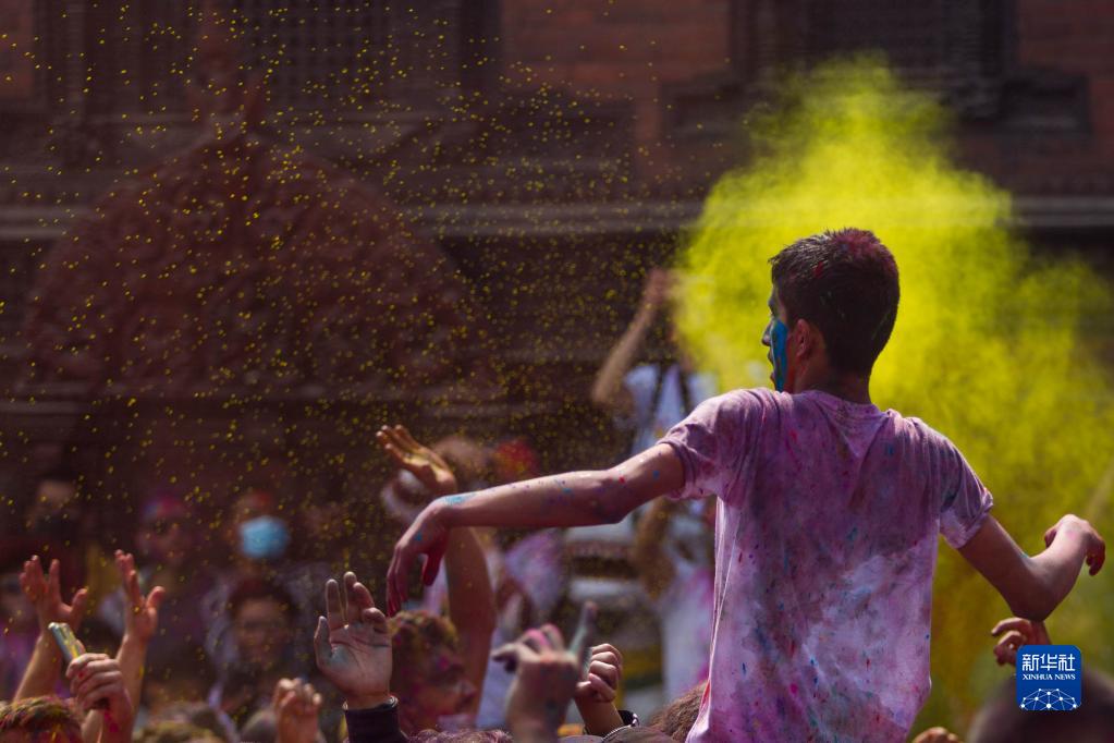 3月6日,人們在尼泊爾加德滿都參加灑紅節慶?;顒?。