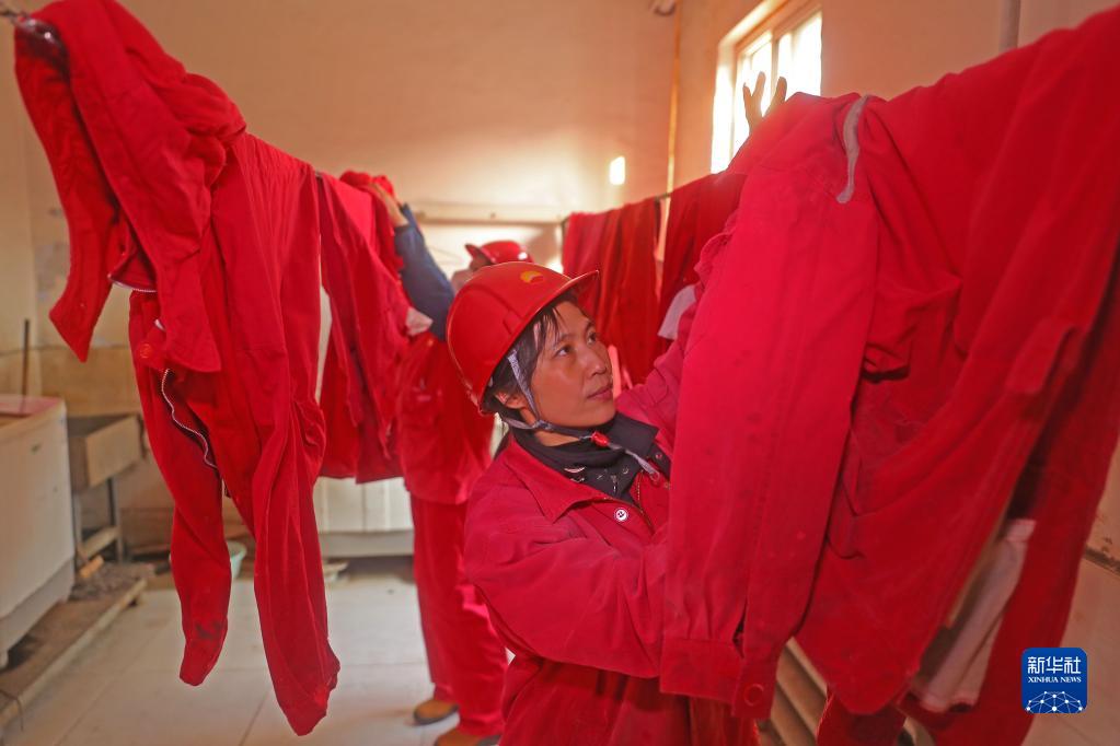2月27日,在焊接車間洗衣房,王喜蓮在晾曬工服。