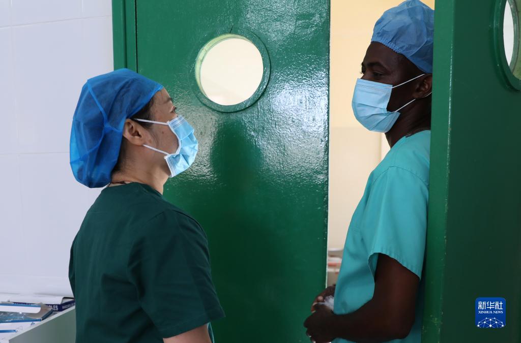 2月23日,在坦桑尼亞桑給巴爾島納茲莫加醫院,董莉莉(左)在術前與桑給巴爾同事交流。