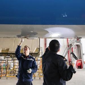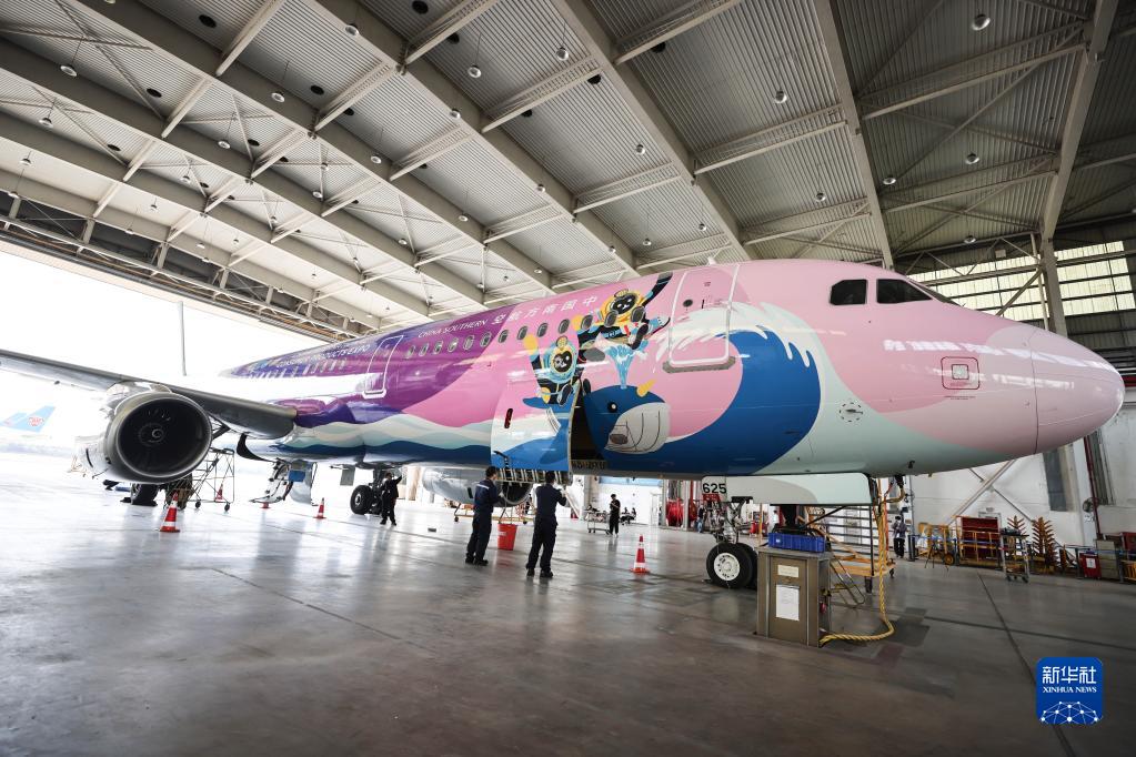 3月7日,在??诿捞m國際機場,南航機務人員對“消博號”彩繪飛機進行深度檢查。