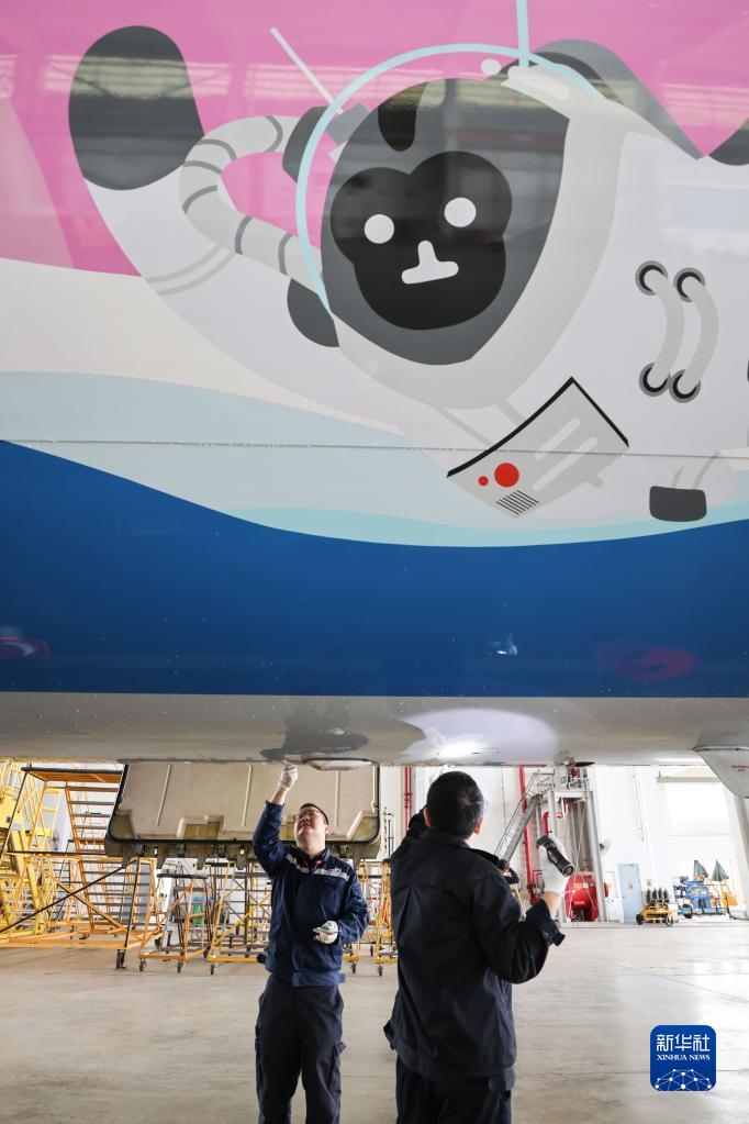 3月7日,在??诿捞m國際機場,南航機務人員對“消博號”彩繪飛機進行深度檢查。
