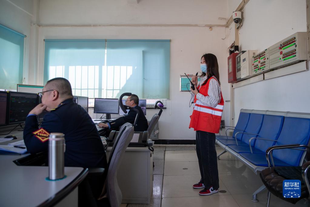 3月6日,在杜爾伯特火車站信號樓,女子檢驗班的王可正在觀察車輛運行情況。