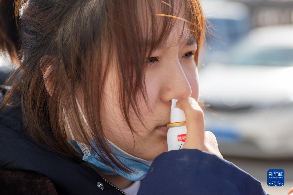 3月6日,在中國鐵路哈爾濱局集團有限公司大慶工務段杜爾伯特線路車間,女子檢驗班的苑鵬鵬在出發前用藥減輕身體不適。