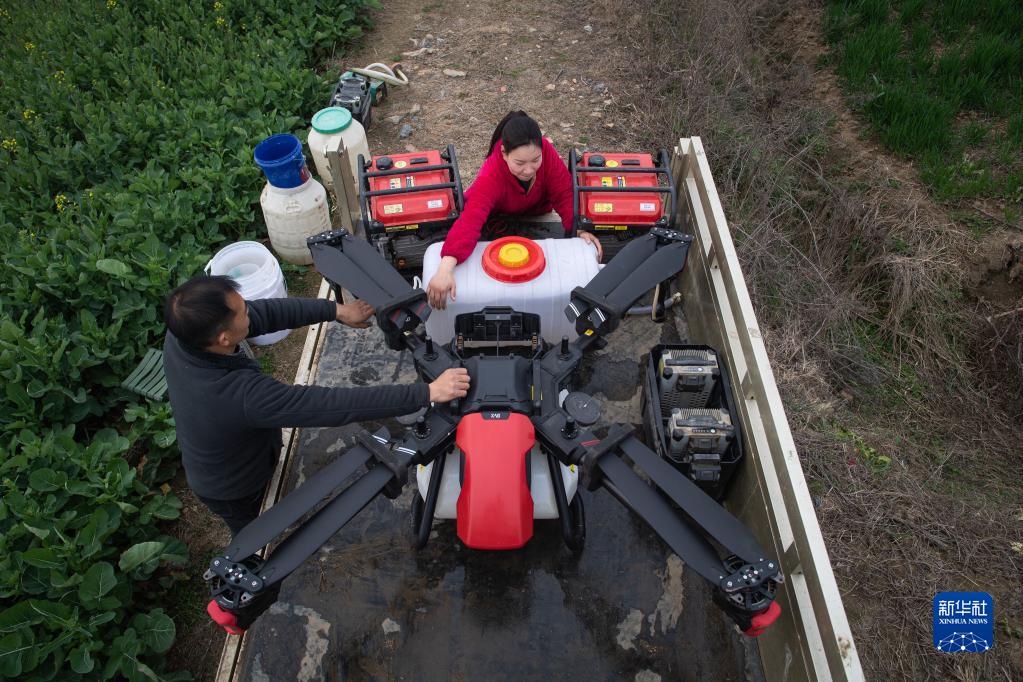3月1日,女飛手吳玲(右)與丈夫準備利用植保無人機進行噴藥作業。