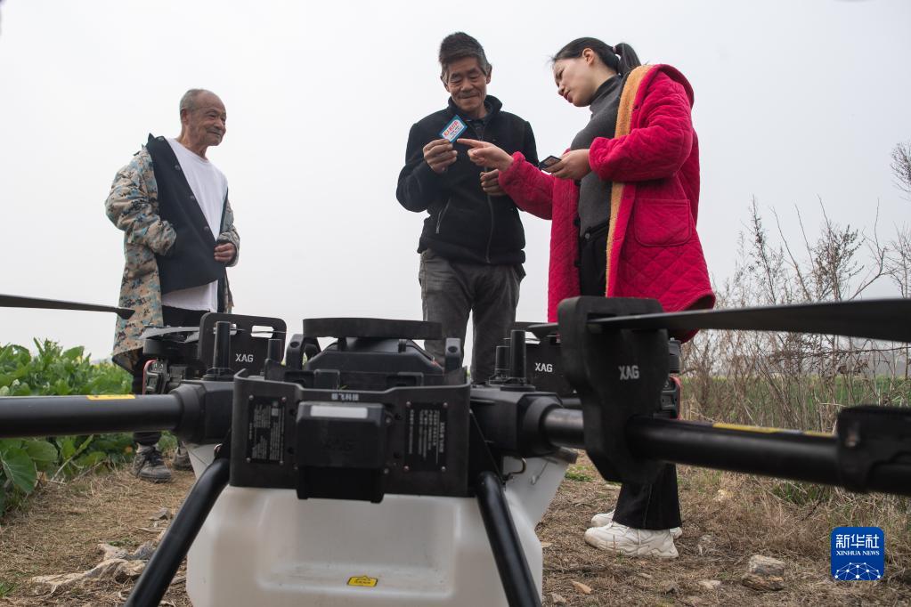 3月1日,女飛手吳玲(右一)向農戶宣傳推廣無人機植保技術。