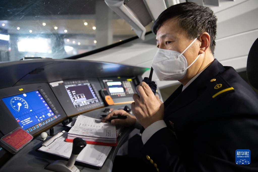 邢云堂在G924次高鐵列車駕駛室內與車站工作人員溝通(2月18日攝)。