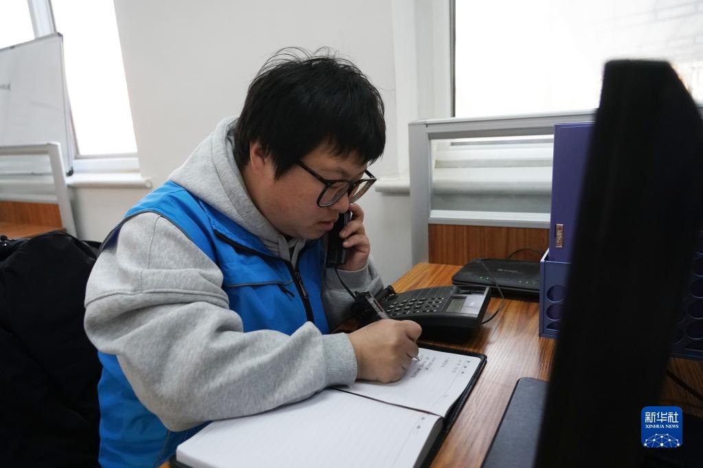 2月22日,在北京市峪口鎮西樊各莊村,王巖峰在辦公室打電話詢問老人的生活情況。