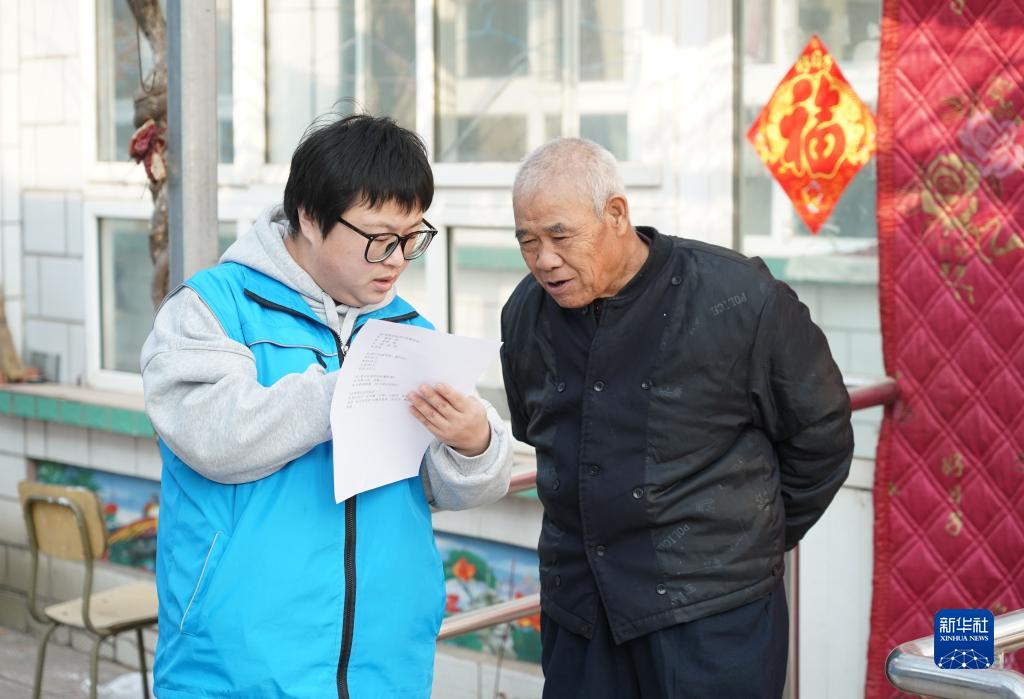 2月22日,在北京市峪口鎮西樊各莊村,王巖峰與獨居老人一起填寫老年驛站問卷。