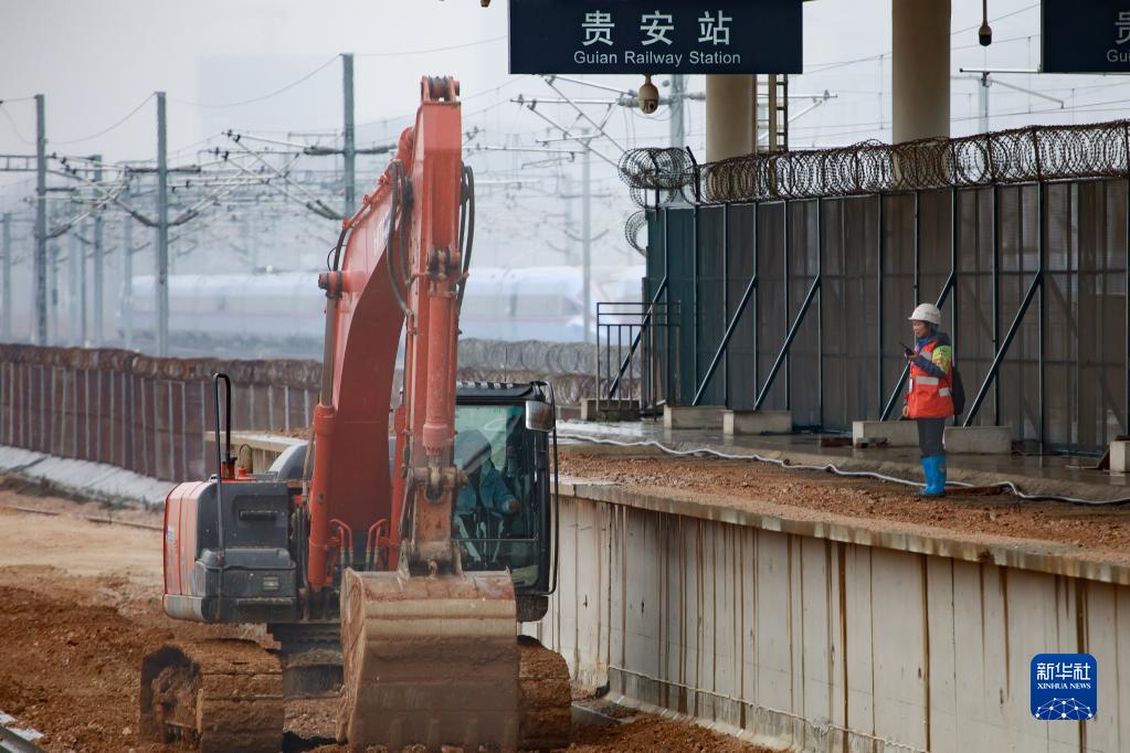 3月7日,在高鐵列車通過時,中鐵八局女職工劉獻英在挖掘機旁。