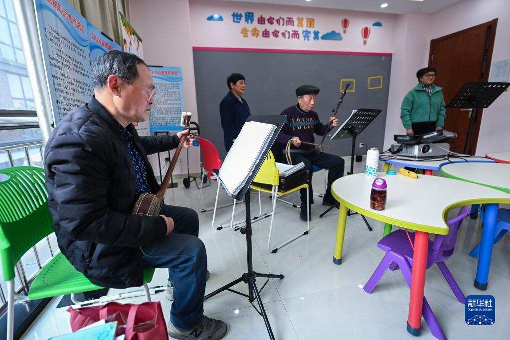 3月7日,在嘉興市南湖區南江社區的老年大學教室內,老人們在排練戲曲節目。