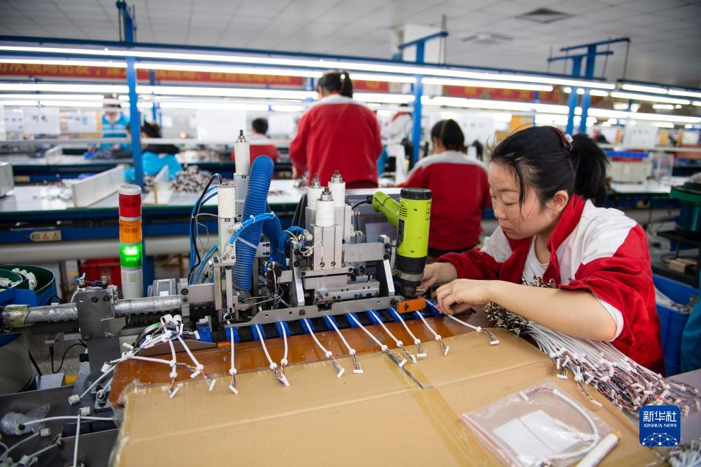 3月7日,在汨羅市神鼎山鎮豐倉村的“巾幗車間”,工作人員在焊接數據線。